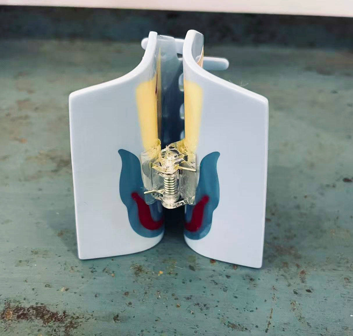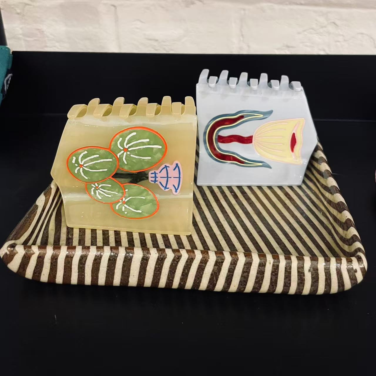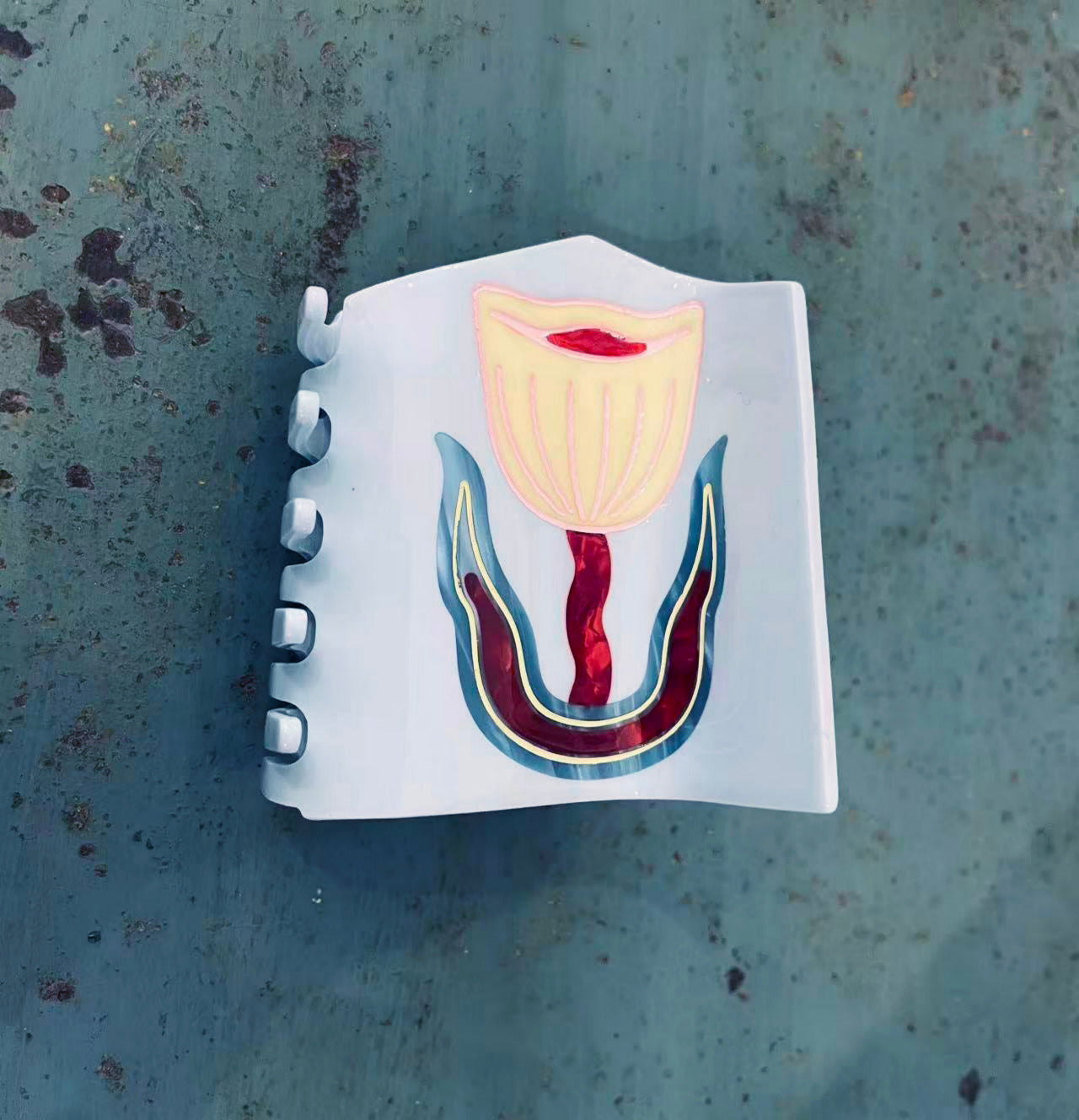 Acetate hair claw featuring a hand-painted abstract flower in soft sky blue, warm yellow, and deep red tones. The graphic, slightly surreal motif gives this piece a playful yet considered feel — like a tiny wearable artwork.