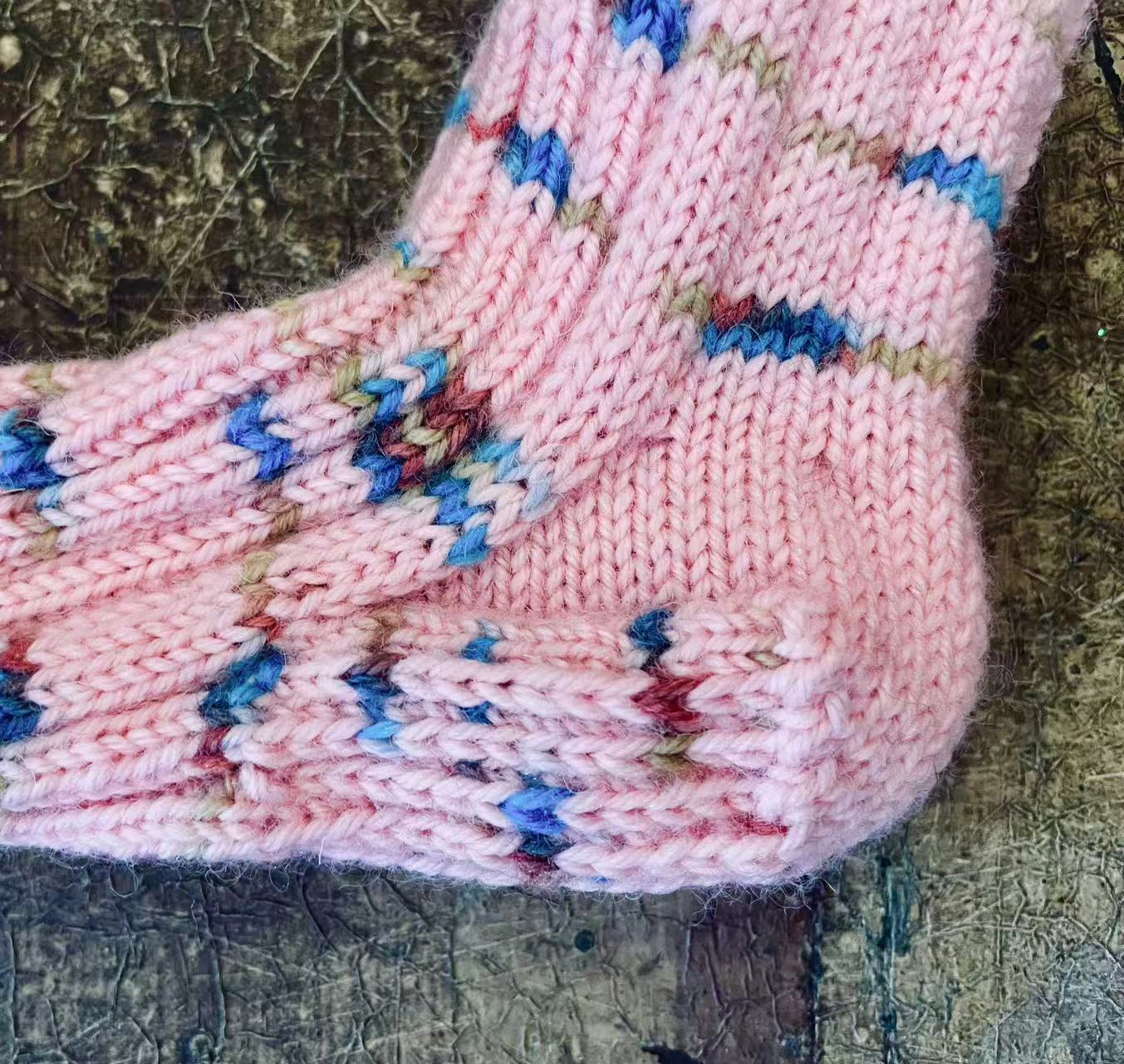 One-of-a-kind wool socks. The pair of socks is entirely unique and hand knitted from a mix of available dead-stock wool yarns.